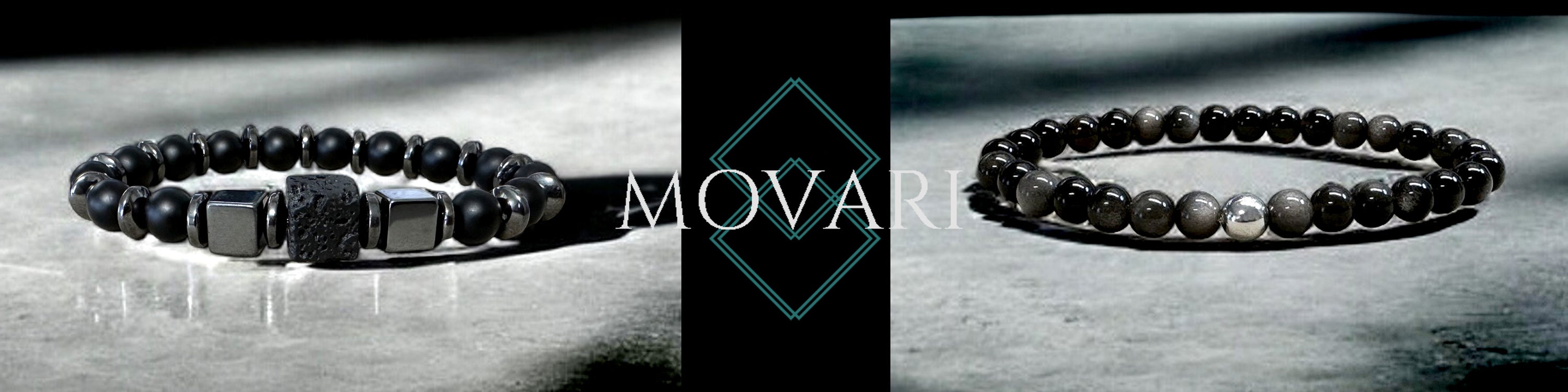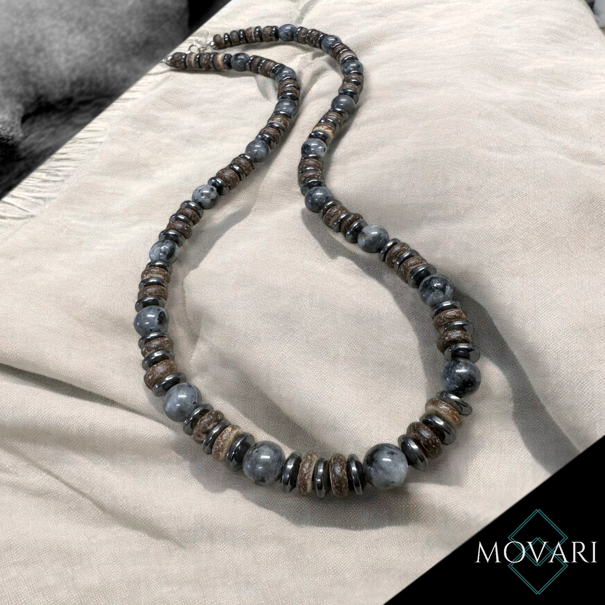 Photo features a Movari signature design incorporating AAAA Matte Onyx, Hematite in 8mm and a 10mm Labradorite center stone with stunning flash.